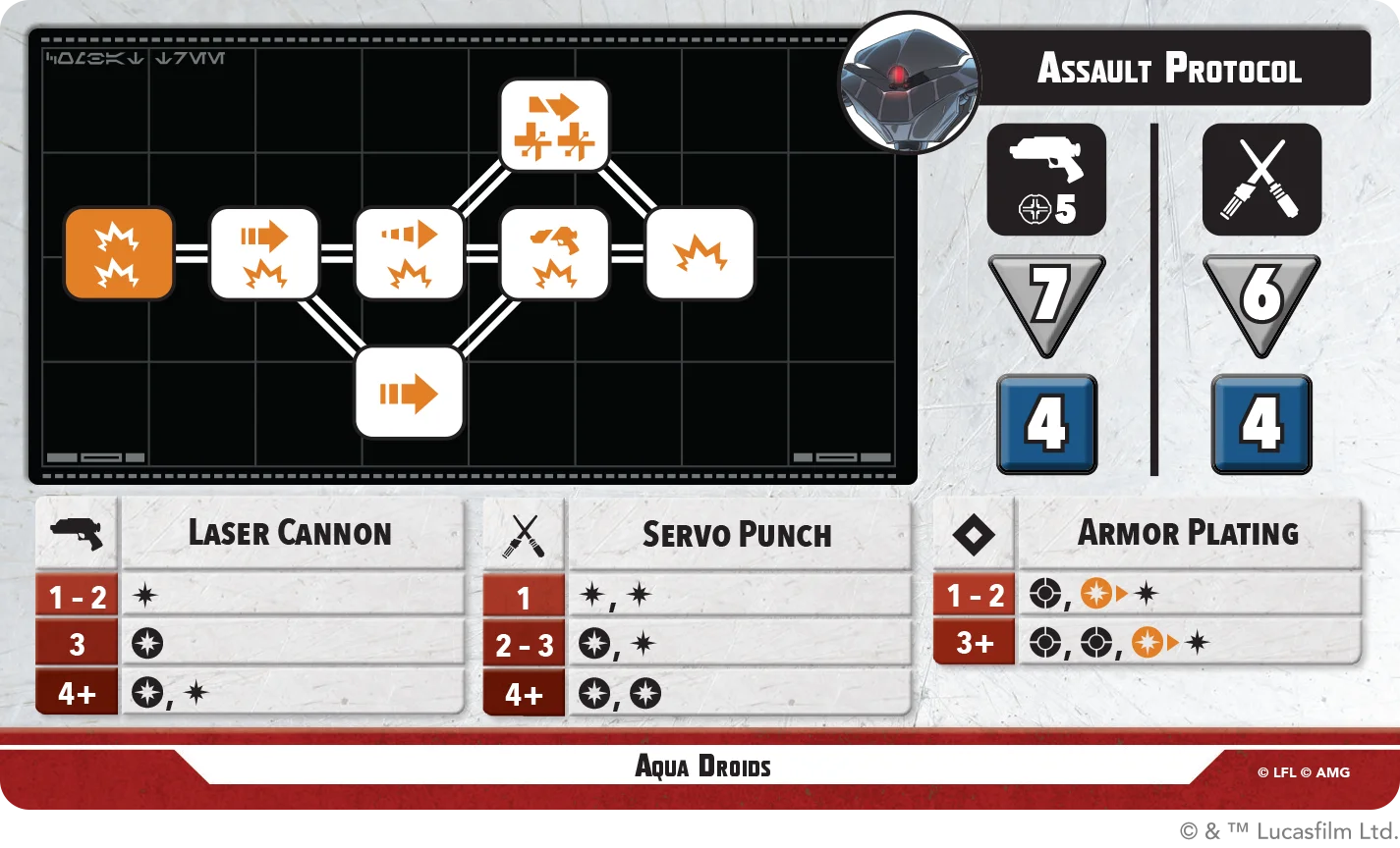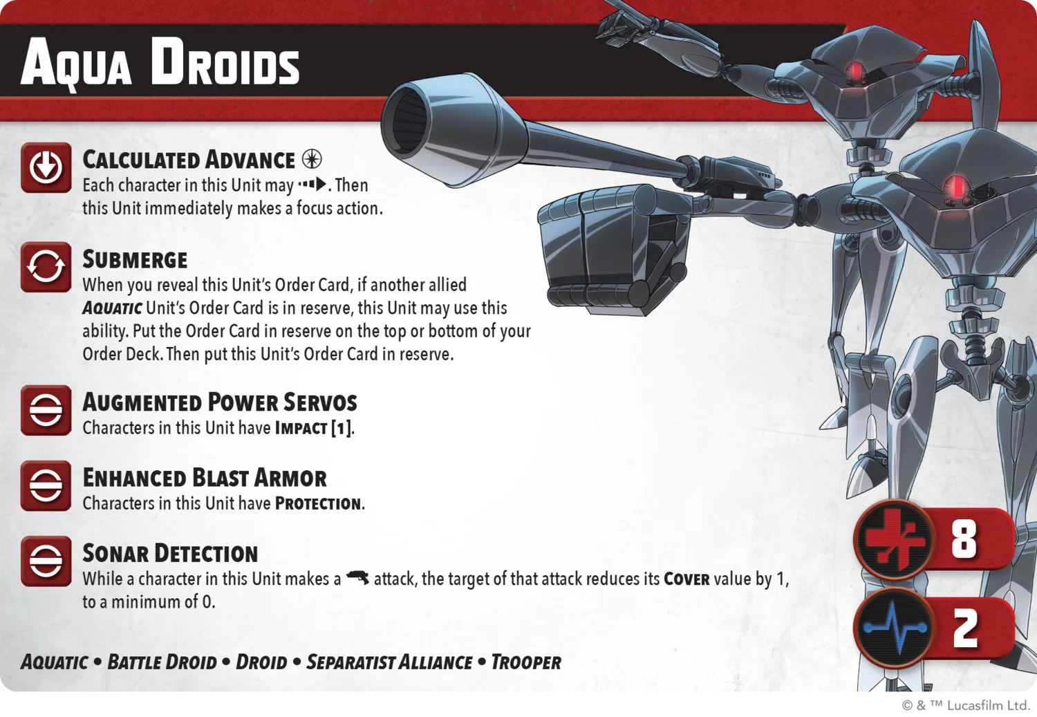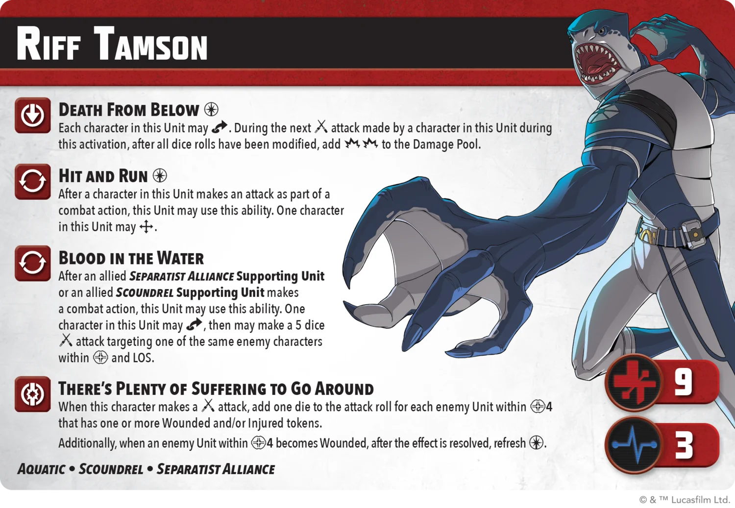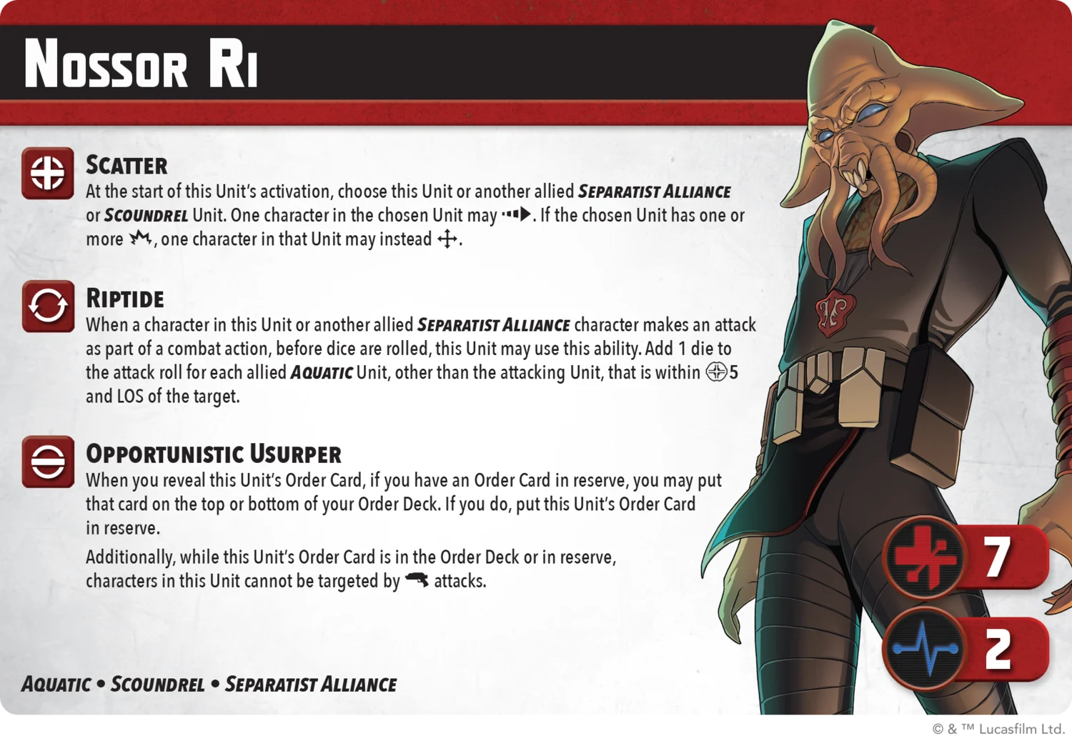 he depths of Mon Cala stir with Separatist aggression. Riff Tamson lunges into battle with razor-edged speed, striking hard before slipping away, while Nossor Ri turns the high ground into a tactical weapon. Backed by durable Aqua Droids built for brutal forward pressure, this squad turns the tide, one objective at a time. Check out their rules in today’s transmission!