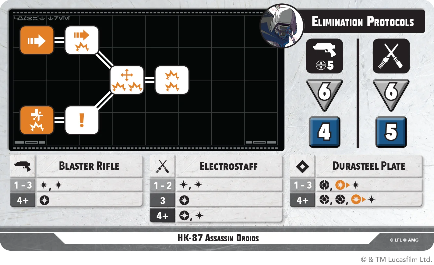Their Reactive Ability, Avoidance Protocols, allows them to shed all Hunker tokens after being attacked and, if any were removed, Dash in any direction. This gives the HK-87 Assassin Droids an unusual blend of stickiness and escape, letting them disengage after absorbing pressure or reposition to better re-engage on their terms.