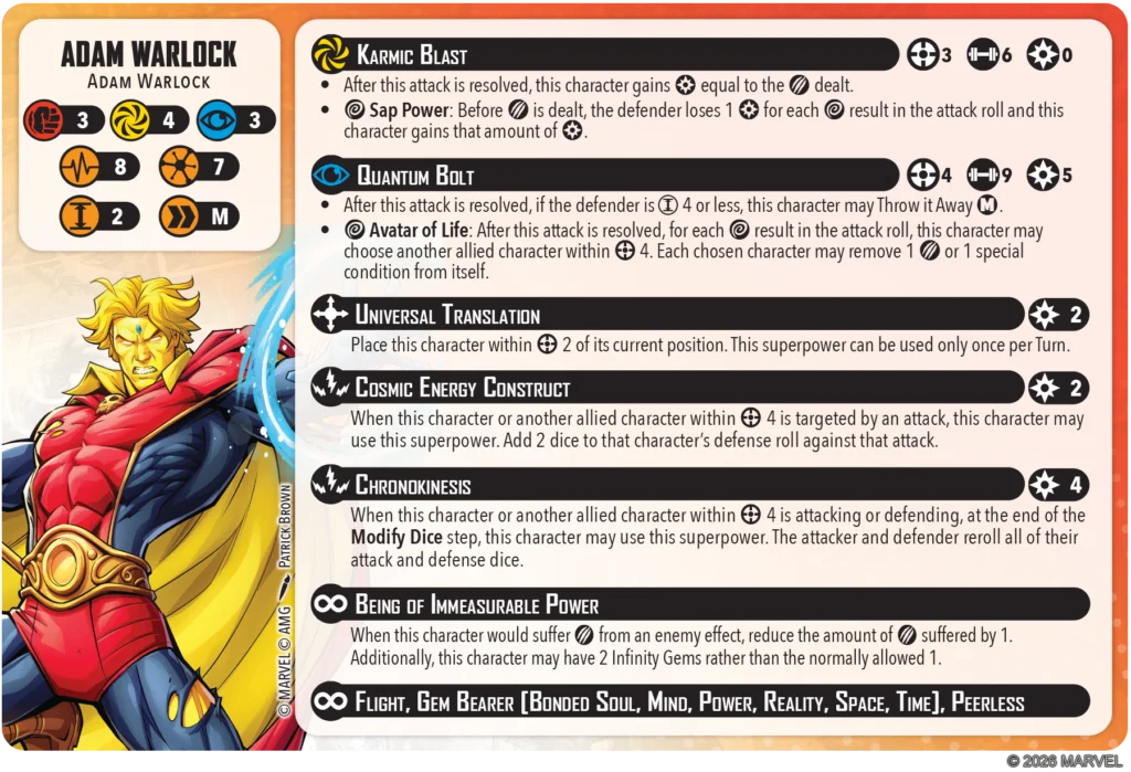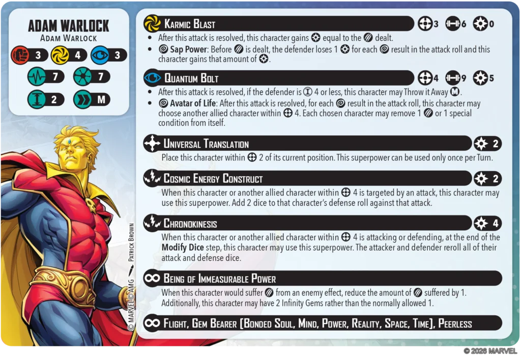 Adam Warlock joins Marvel: Crisis Protocol as a Peerless character, a being of such power you are unable to include him in a squad with another Peerless character. Even if you could though include him with another though, measuring the power he exudes comes in at a whopping 7 Threat. Thankfully that investment includes 15 Stamina spread across both sides of his card and various superpowers that will help keep him battling it out across the tabletop.