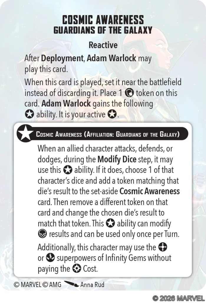 Although Adam Warlock doesn’t natively have a Leadership for the affiliation, he is able to leverage his powerful Cosmic Awareness to bring one to the battlefield.